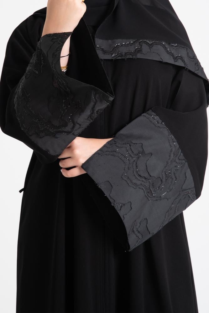 عباية من قماش الكريب مزينة بقماش مشجر على الاكمام