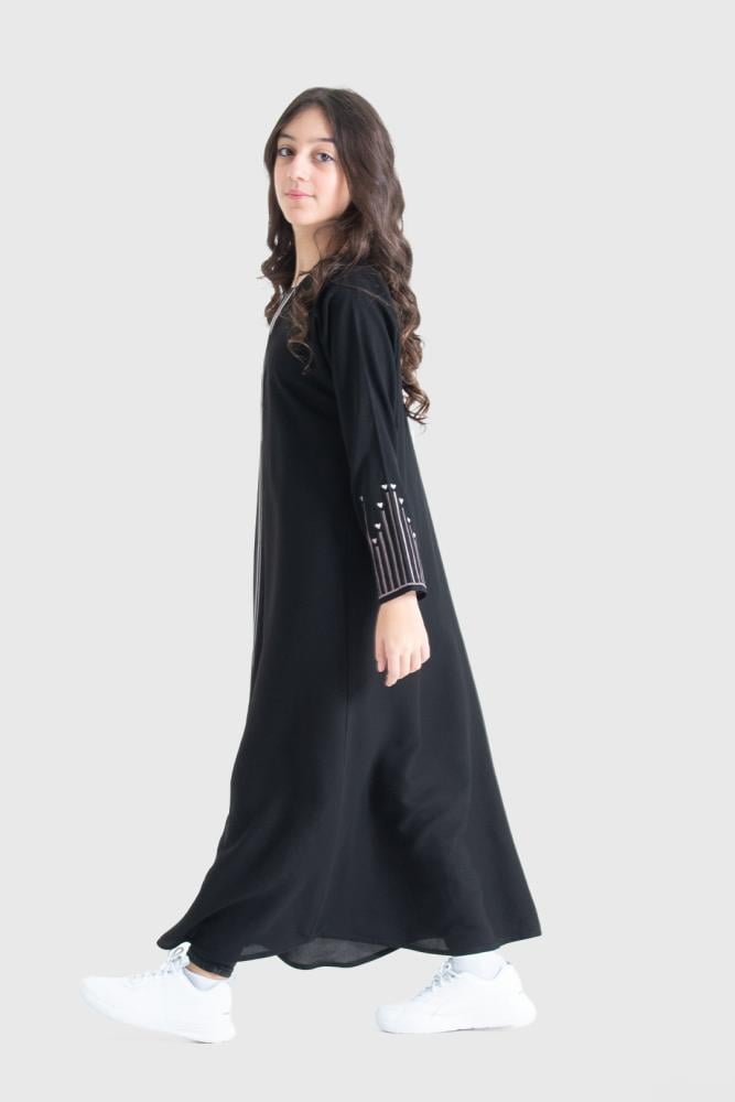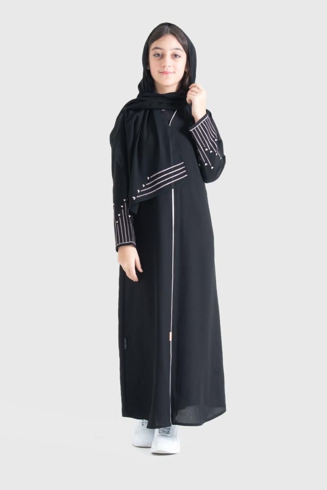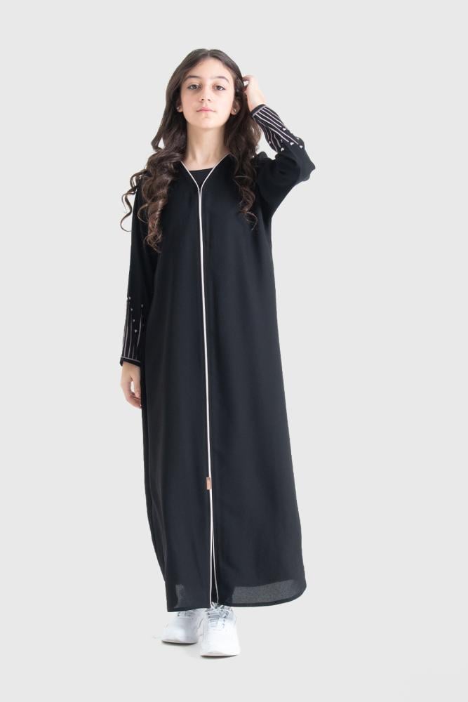 عباية بناتيمن الكريب الفاخر مزينة بتطريز ناعم على الاكمامالقفلة زرارالكم عادياللون اسود(الطرحة مجاناً)