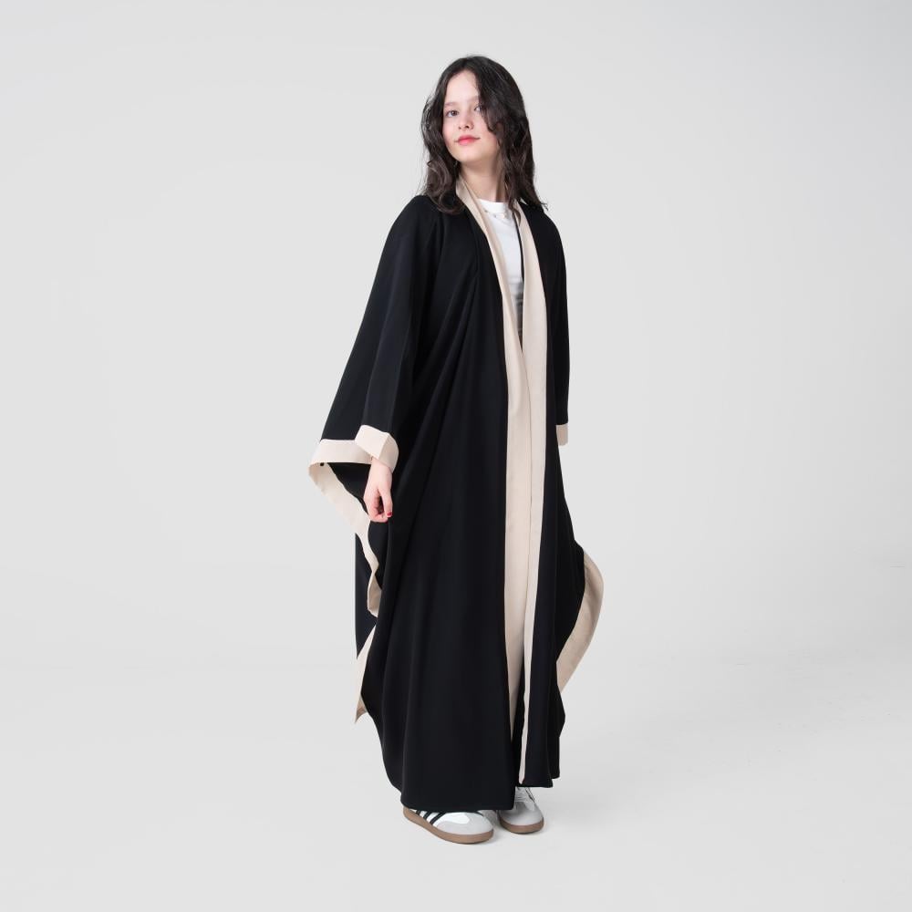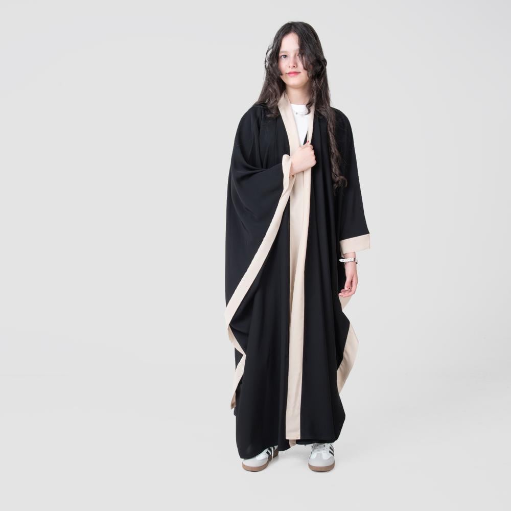 عباية بناتي مشلح لف ناعمة من قماش الحرير مطعمة بالاطراف بقماش من الساتان باللون البيجالقفلة لفاللون اسود(الطرحة مجاناً)