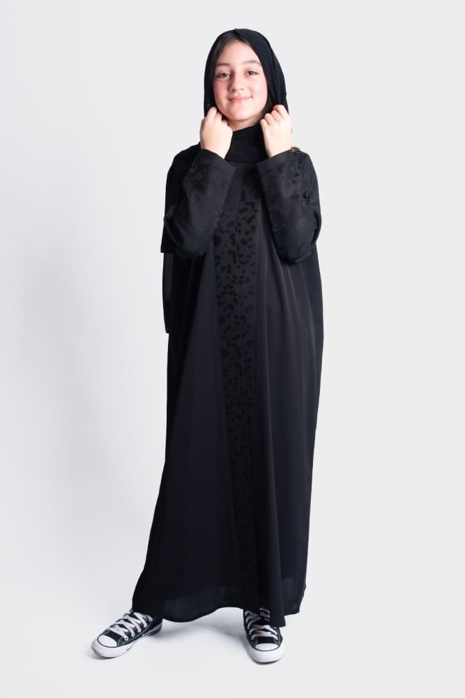 عباية بناتي لف بقماش ناعم على الاطراف مضاف له قماش مشجر على الاكمامالكم عادياللون اسود(الطرحة مجاناً)