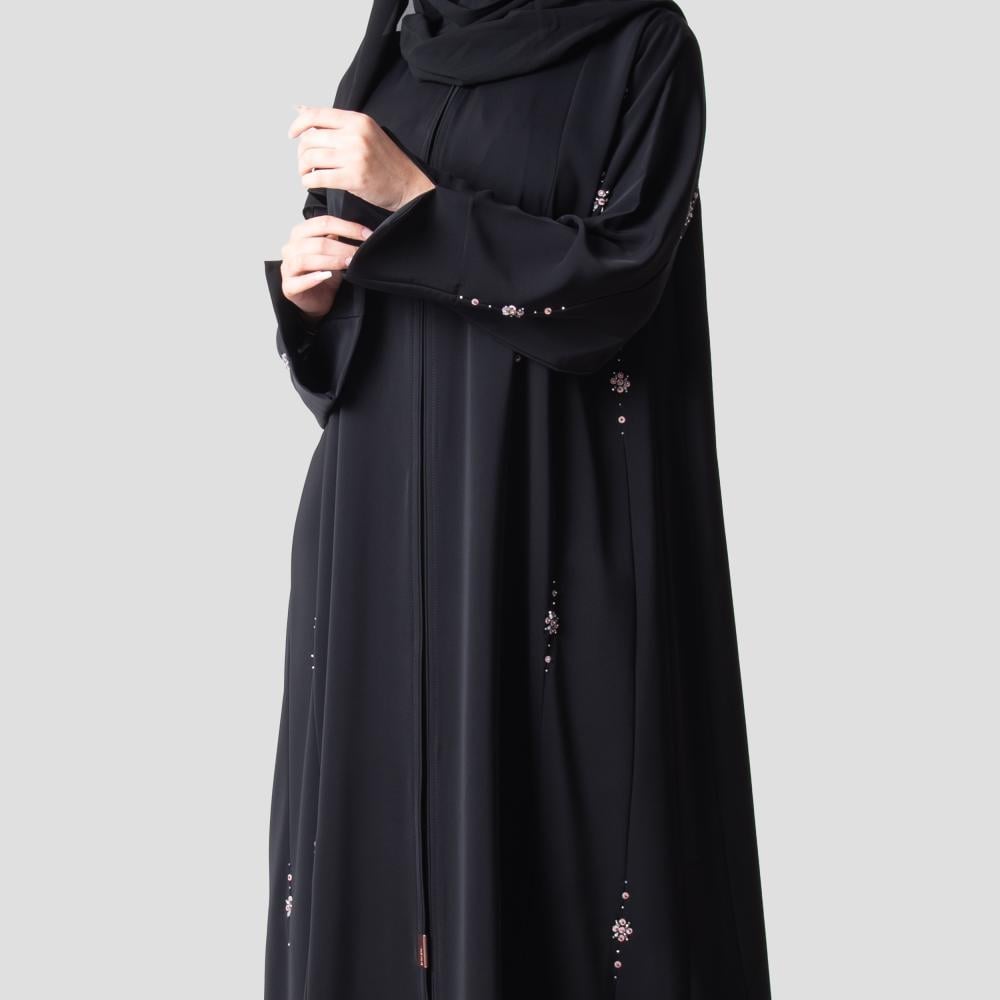 عباية فاخرة مصنوعة من قماش الحرير الراقي بملمسه الناعم وانسيابيته الأنيقة، تتميز بتفاصيل تطريز ناعم يزين التصميم ليمنحها لمسة فخمة وجاذبية مميزة.