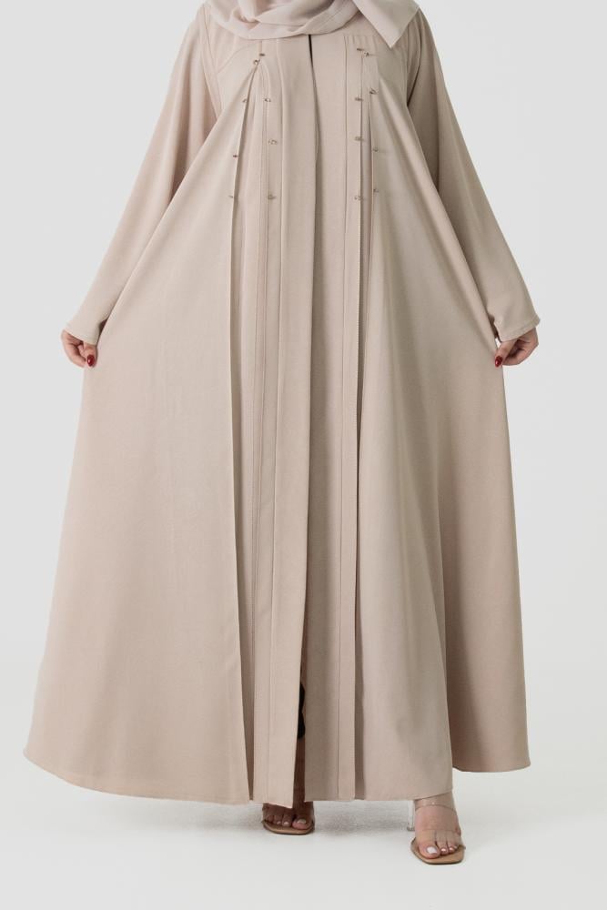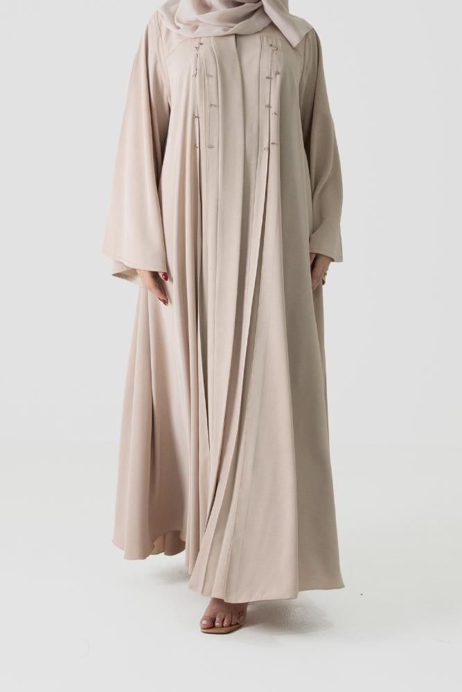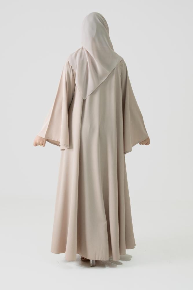 عباية ناعمة من قماش الحرير دبل كلوش ملونةالقفلة مفتوحة زرار واحد في الاعلىالكم مربعاللون بيج(الطرحة مجاناً)