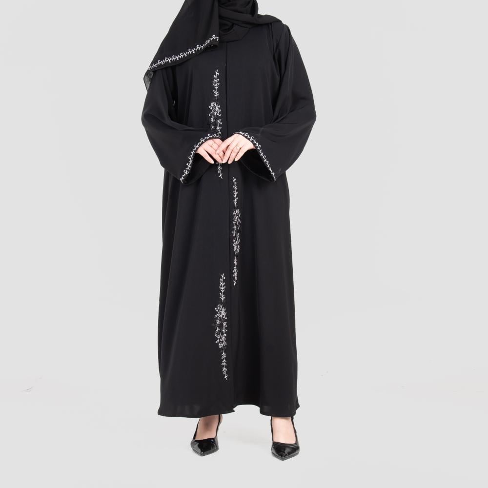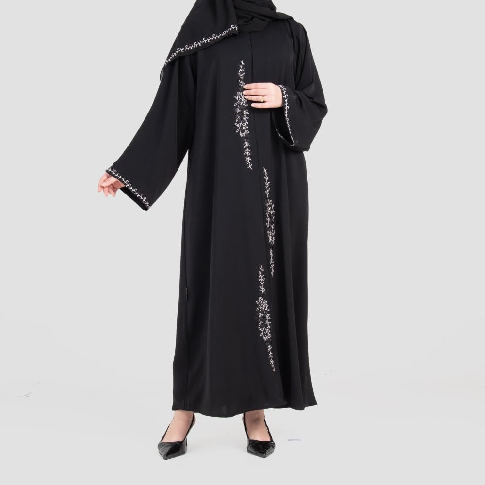 عباية فاخرة بتصميم راقٍ من قماش الحرير الناعم المعروف بملمسه الفخم وانسيابيته اللامعة. تتميز العباية بتطريز أنيق من الأمام وعلى الأكمام بتفاصيل دقيقة تضيف لمسة من الفخامة والأنوثة.