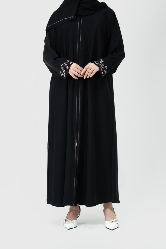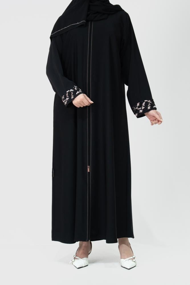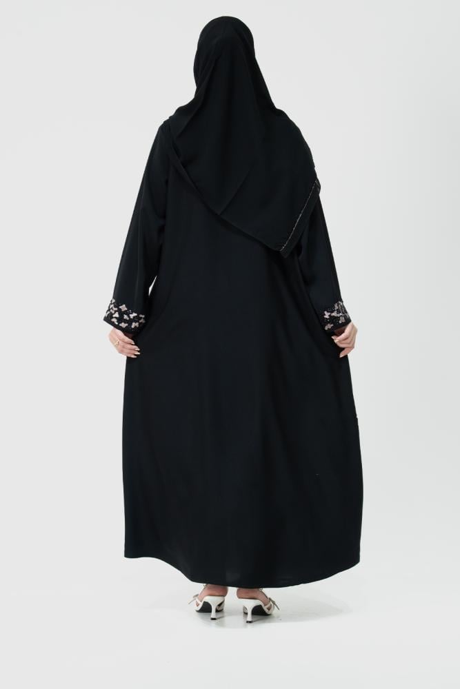 عباية بقماش ناعم من الحرير مزينة بتطريز يدوي على الأكمامالقفلة زرارالكم عادياللون اسود(الطرحة مجاناً)