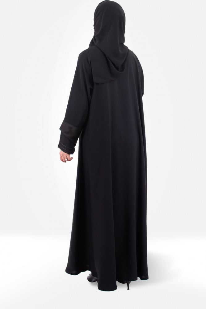 عباية كلوش بتصميم أنيق وفريد من نوعها مصنوعة من الحرير الفاخر. تعطي لمسة جمالية على المظهر العام بفضل التصميم الأنيق الذي يتميز بزخارف مميزة على الأكمام. تأتي مع قفلة زرار للإغلاق والثبات، وتتميز بأكمام مريحة تناسب مختلف الأذواق. يأتي بلون أسود كلاسيكي تعتبر لمسة من الأناقة والجاذبية على الإطلالة. هذه العباية المميزة تجمع بين الأناقة والراحة وتضيف لمسة ساحرة على إطلالتك في المناسبات الخاصة واليومية.